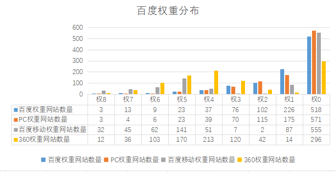 - 百度權重網站數量和PC端網站數量基本一致,但百度移動權重中,權8的就有32個,比例遠超PC端,看來移動端終究是流量大頭,很多網站的移動端權重都不錯。